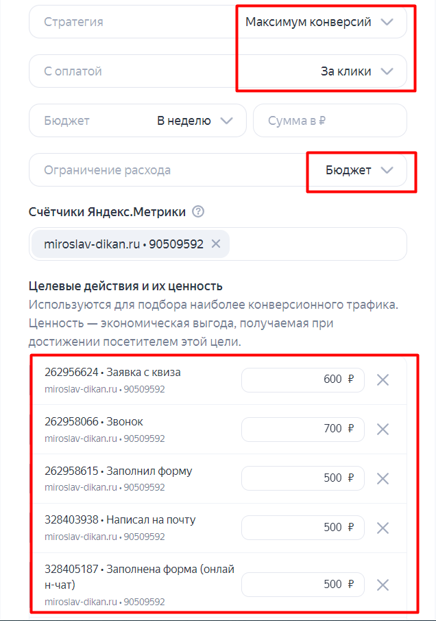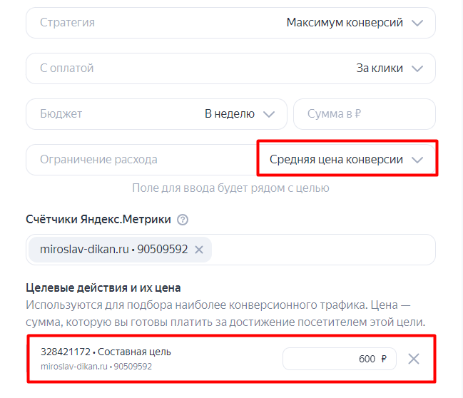 Итак, когда цель создана, в настройках стратегии для я чаще выбираю ограничение расхода либо по "недельному бюджету", либо по "средней цене конверсии" и указываю ее среднее значение, а модель оплаты — за клики. Модель оплаты за конверсии я в данной статье не рассматриваю. Большая часть трафика в моих проектах и проектах коллег приходит по модели оплаты за клики.