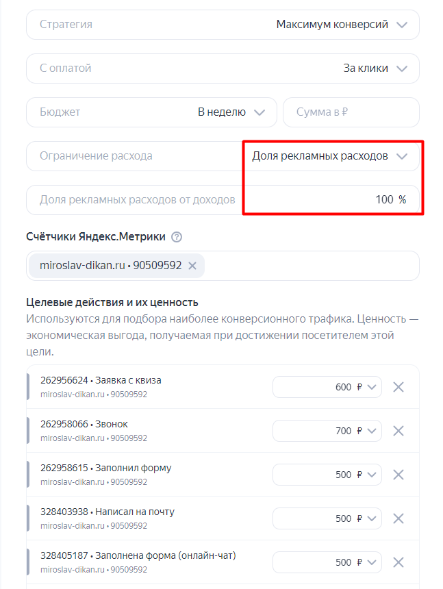 Казалось бы, ограничение расхода по ДРР используется только для интернет-магазинов, то это не так. Подобную стратегию мы можем применить для любого типа сайта или лендинга. Мы полагаем, что ДРР 100% = расходы / доходы * 100%, при этом доход с одной конверсии это и есть ценность конверсии, которую мы указываем для каждой цели.