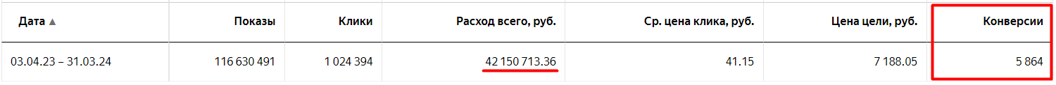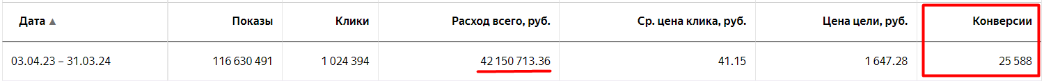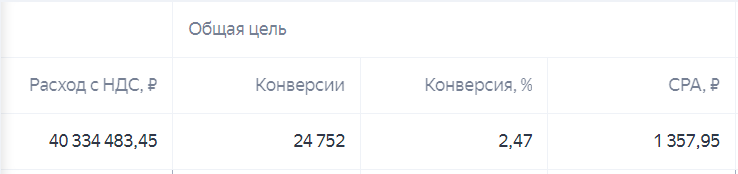 Единственным местом пересечения был каждый 4-й лид, который достигался по обеим кампаниям, но обе РК работали за клики, а не за конверсии, поэтому тут это не важно. Возможно, имела место каннибализации трафика, но выгода от запуска кампании с микроцелью очевидна — она принесла дополнительно 50% лидов от кампании с макроцелью, к тому же по цене почти вдвое меньшей: 1 577 руб против 2 679 руб.