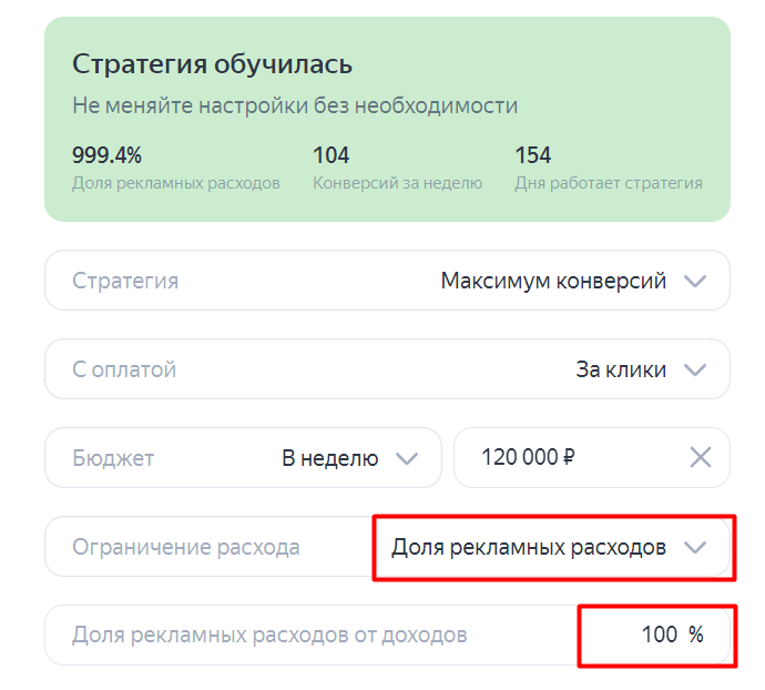 Это первый вариант одновременного использования нескольких целей. Второй вариант — выбрать ограничение расхода по "доле рекламных расходов" со значением 100%. Остальные настройки оставить прежними.