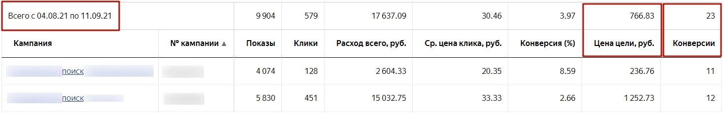 Итак, когда у меня была ссылка на фид для Яндекса, я настроил рекламную кампанию со Смарт-баннерами (на Москву), а также еще 2 обычные Поисковые кампании на разные гео: на Москву и на регион очень далекий от Москвы. Поэтому цена лида такая разная.