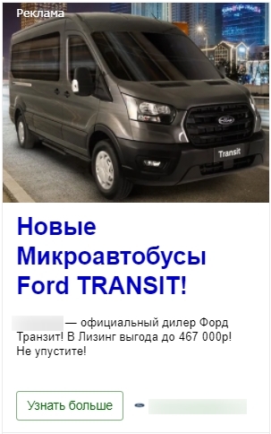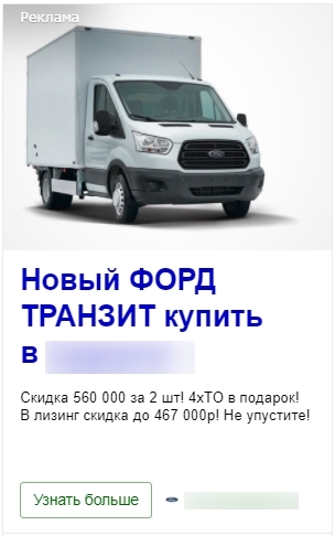 Прежде всего я изучил конкурентов — официальных дилеров Ford TRANSIT. Как оказалось, все они использовали одинаковый лендинг от Ford, это конечно же минус. Но каждый из них рекламировал этот лендинг в своем регионе, и это плюс.