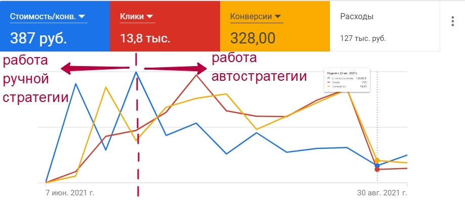 Предлагаю не затягивать, а сразу взглянуть на скриншот, где представлена 2х недельная работа РК на ручной стратегии с 7го по 28е июня (до красной пунктирной линии). Затем я переключился на автостратегию (после красной пунктирой линии):