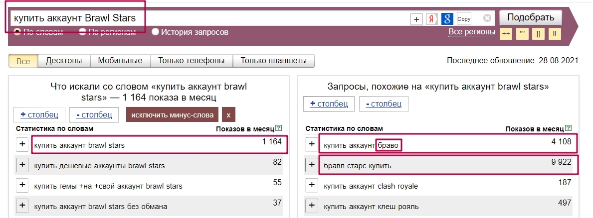 Т.е. в колонке слева по коммерческому запросу «купить аккаунт brawl stars», с официальным названием игры — 1164 запроса в месяц. При этом правая колонка (эхо вордстата) показывает нам, что запросов в русскоязычном написании «…бравл старс» — 9922 в месяц, т.е. гораздо больше.
