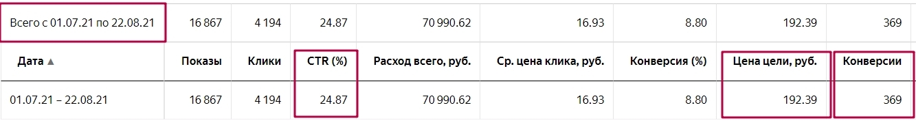 Здесь получился очень интересный CTR = 24.8%, в следствие чего мы и получили хорошую цену клика и показы на первой позации. Конкуренты не сильно заморачивались с релевантностью, потому что объем семантики был большой.