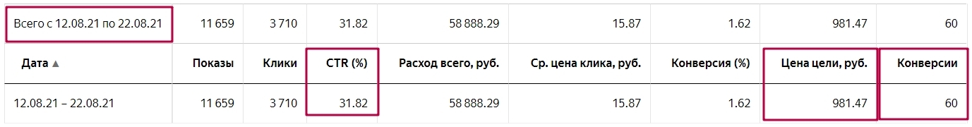 Кликабельность здесь получилась еще выше: CTR = 31.82%, и за 10 дней работы мы получили 60 заявок по 981 р. Цена лида на покупателей выше, чем на продавцов в 3 раза. Это объясняется тем, что продавцы стремятся зарегистрироваться и выложить свой товар на сайте. А покупатели сравнивают цены и «крутят носом» так сказать, поэтому тут уже к вопросам ценообразования на сайте.
