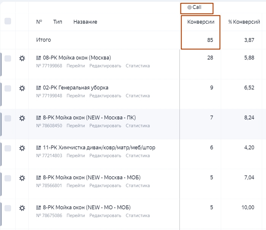 Но далее, возникает проблема №2: Для оптимизации рекламы по конверсиям, мы можем указать только 1 цель. Конечно, из двух целей "Создание лида в Tracker" (заполнение формы) и Target call мы выберем первую, т.к. по ней получено 103 конверсии против 72 по второй цели.