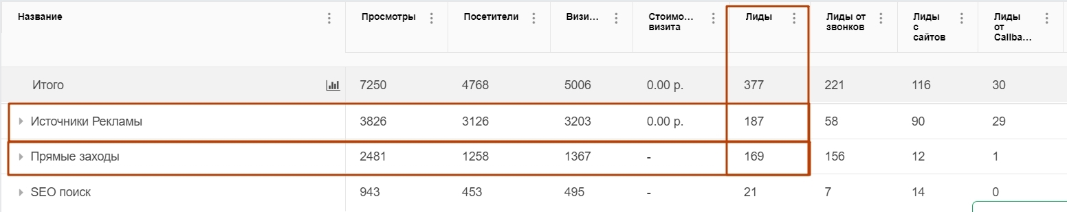 Давайте посмотрим, сколько лидов попало в Метрику по рекламному каналу: